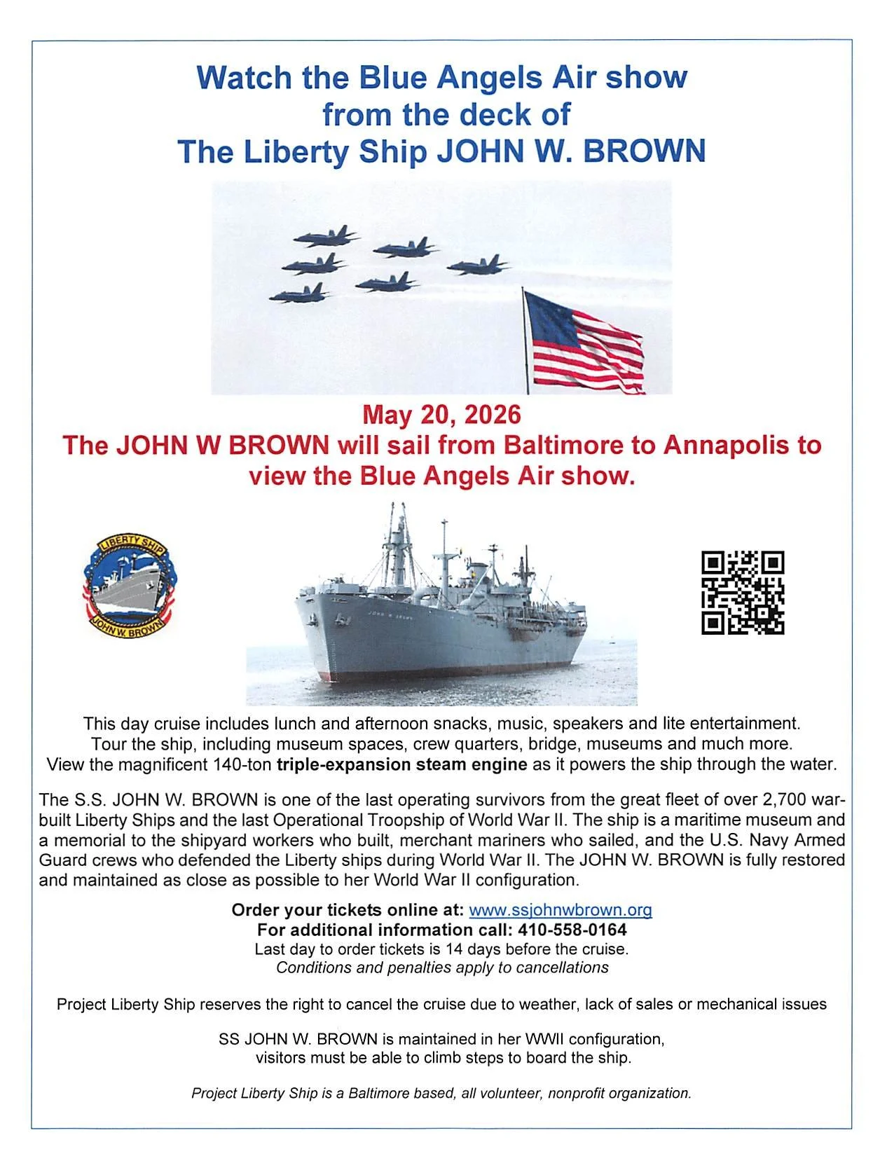 The JOHN W BROWN will sail from Baltimore to Annapolis to view the Blue Angel Air Show